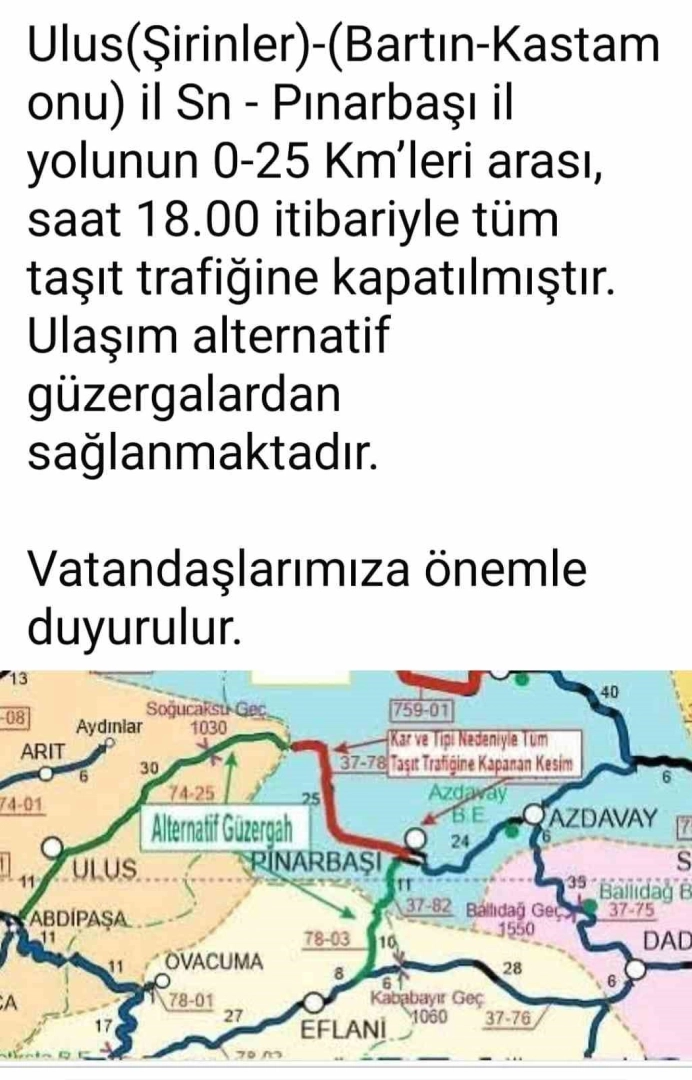 Ulus-Pınarbaşı kara yolunun 0-25 kilometre arasındaki bölümü, yoğun kar yağışı nedeniyle akşam saat 18.00 sıralarında ulaşıma kapandı. Bölgede tipinin de etkili olması nedeniyle kar temizleme çalışmalarının yürütülemediği öğrenilirken, ulaşımın çevredeki alternatif güzergahlara yönlendirildi bildirildi. Çevredeki köylerin sosyal medya hesaplarından yapılan paylaşımlarda ise sürücüler uyarıldı. Yapılan bir paylaşımda, "Yoğun kar yağışı sebebiyle 37-78 KKNo’lu Ulus (Şirinler)-(Bartın-Kastamonu) il sınırı- Pınarbaşı il yolunun 0-25 km’leri arası, saat 18.00 itibarıyla tüm taşıt trafiğine kapatılmıştır. Ulaşım alternatif güzergahlardan sağlanmaktadır. Vatandaşlarımıza önemle duyurulur" denildi.