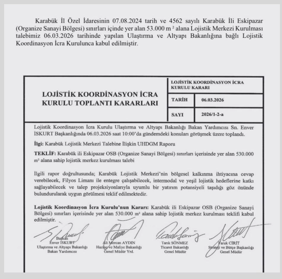 Karabük’te kurulması planlanan Lojistik Merkezi Projesi, Ulaştırma ve Altyapı Bakanlığı Lojistik Koordinasyon İcra Kurulu tarafından kabul edilerek resmen onaylandı.