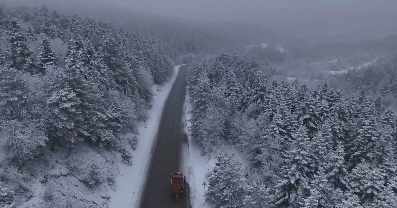Kar yağışı ve sisin etkili olduğu bölgede oluşan manzara havadan görüntülenirken, Karayolları ekipleri de ulaşımda aksama yaşanmaması için kar küreme ve tuzlama çalışması gerçekleştirdi.