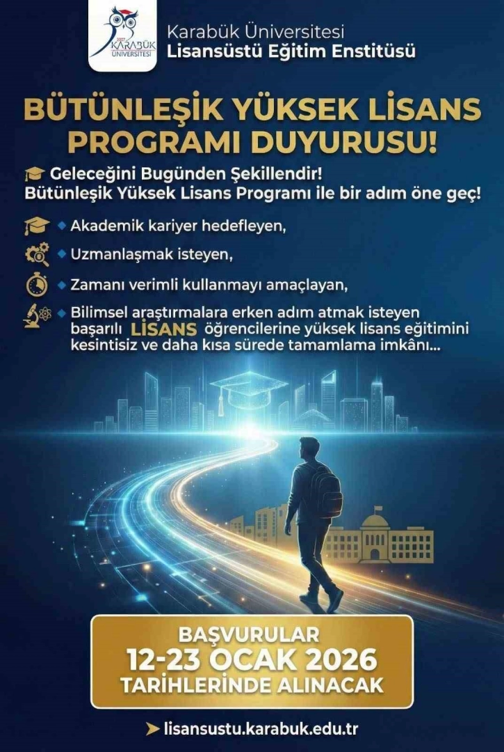 Karabük Üniversitesinde bütünleşik yüksek lisans programı için başvurular 12-23 Ocak 2026 tarihleri arasında alınacak.