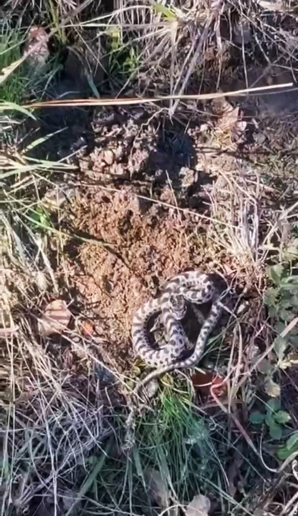 Karabük’ün Eskipazar ilçesinde bir vatandaş, mantar topladığı sırada karşılaştığı engerek yılanını cep telefonu kamerasıyla kaydetti.
