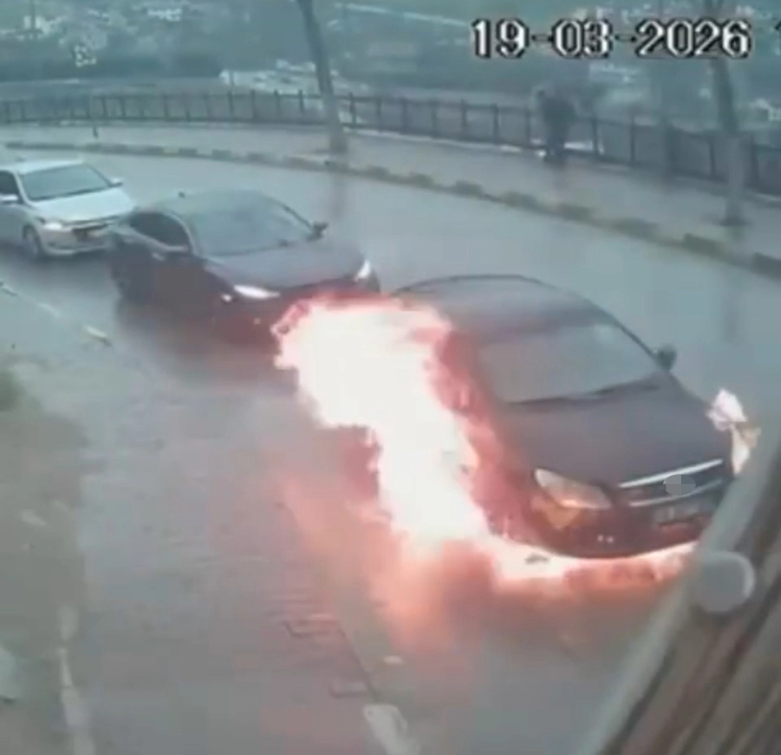 Sürücü ve yolcu son anda araçtan çıkarak kurtulurken, yangın anı güvenlik kamerasına yansıdı.
