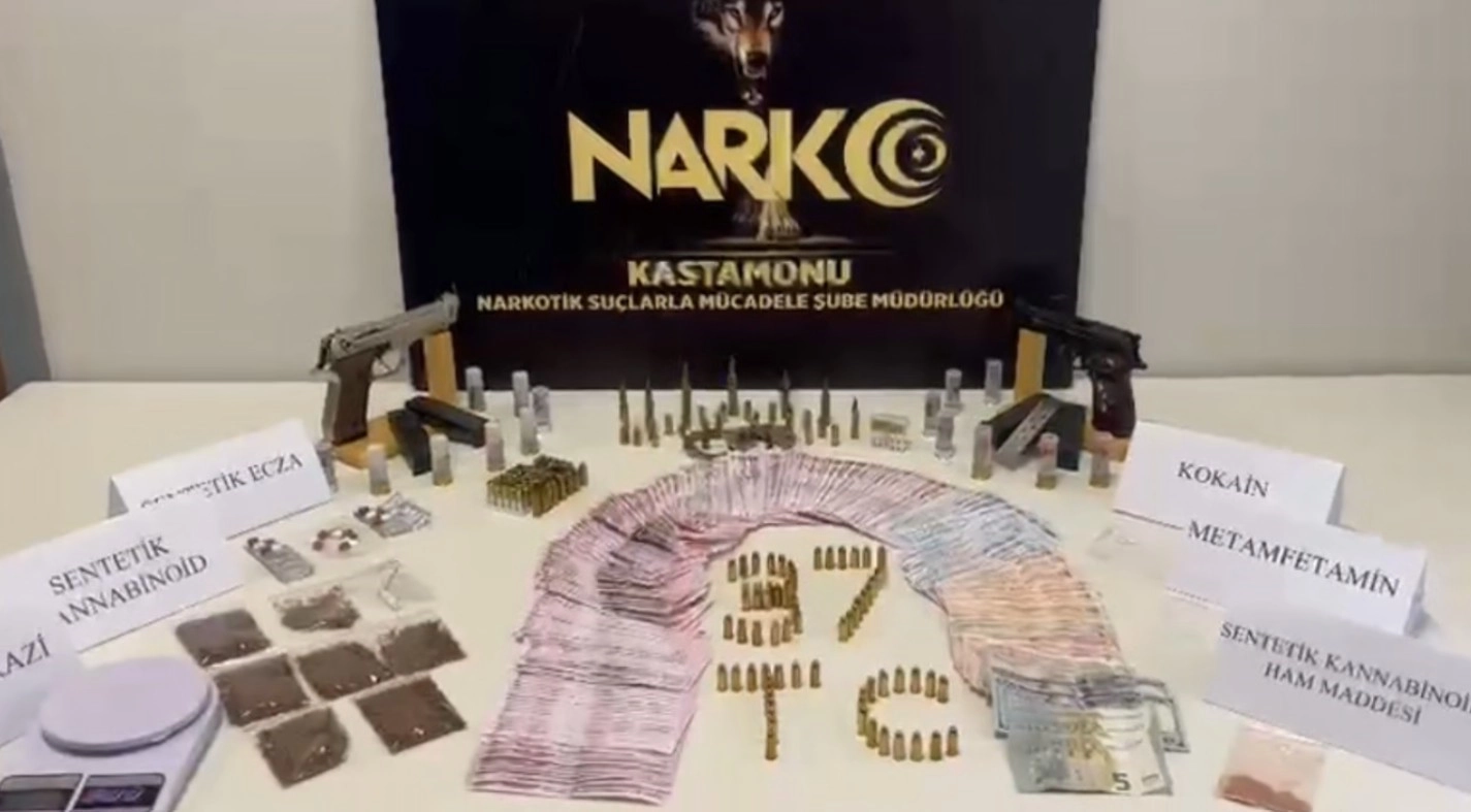 Edinilen bilgiye göre, Kastamonu İl Emniyet Müdürlüğü Narkotik Suçlarla Mücadele Şube Müdürlüğü ekiplerince, il merkezi ve Araç ilçesinde uyuşturucu madde ticareti yapan şahıslara yönelik operasyon düzenlendi. Tespiti yapılan 21 şüpheli şahsa ait 23 adrese eş zamanlı düzenlenen operasyonda, 9,34 gram kannabinoid ham maddesi, 35,46 gram kannabinoid, 1,01 gram içime hazır 1 adet sigara, 13 adet sentetik ecza hapı, 0,09 gram kokain, 1 adet ruhsatsız tabanca, 1 adet kuru sıkı tabanca, 5 adet tabanca şarjörü, 147 adet farklı çaplarda tabanca fişeği, 7 adet farklı çaplarda uzun namlulu silah fişeği, 5 adet kuru sıkı fişeği, 16 adet av tüfeği kartuşu, uyuşturucu madde ticaretinden elde edildiği değerlendirilen 33 bin 200 TL, 1 adet hassas terazi, 1 adet uyuşturucu ticaretine ilişkin not defteri ve 1 adet kelepçe ele geçirildi. Operasyonda 20 şüpheli yakalanarak gözaltına alındı.