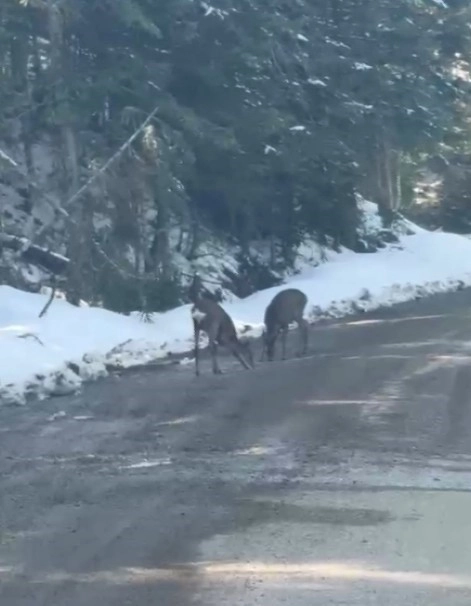Kastamonu’nun Daday ilçesinde yoldaki çukurdan su içen karacalar, su içerken görüntülendi