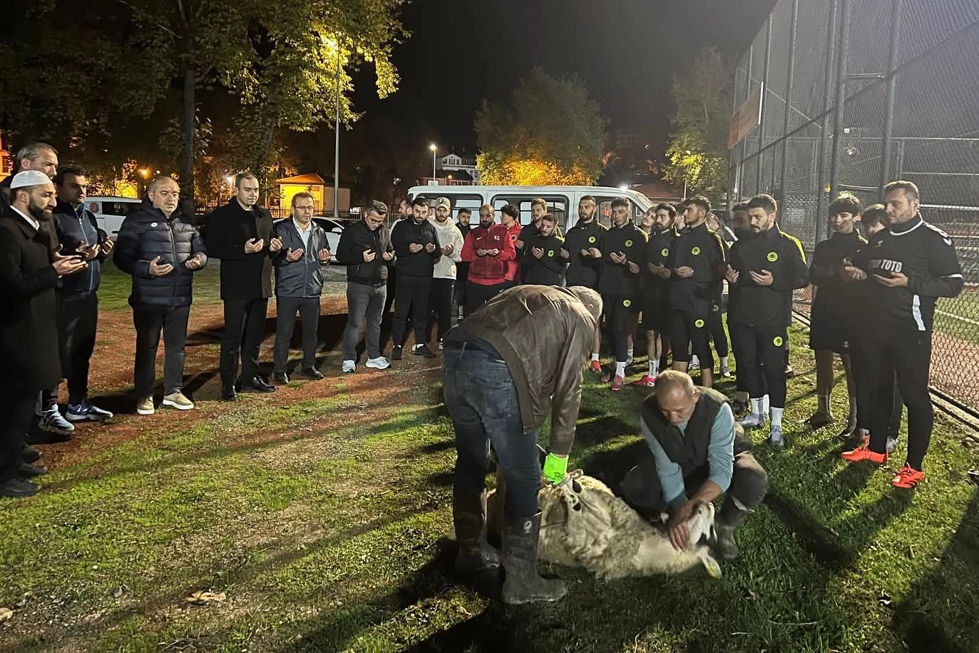 Dualar eşliğinde kesilen kurbanın ardından, katılımcılar yeni sezonun hayırlı, başarılı ve sakatlıksız geçmesi için temennilerde bulundu.
