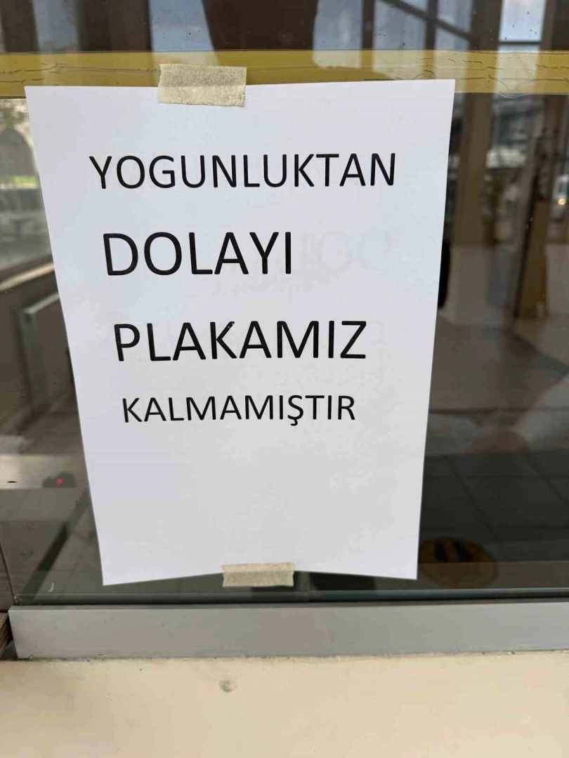 Yaşanan yoğunluk nedeniyle oda bugün, ‘Yoğunluktan dolayı plakamız kalmamıştır’ şeklinde yazı asarak sürücüleri bilgilendirdi. Şoförler Odası’nda günlük bin adet basımı yapılan yeni plakaların yarından itibaren basım işleminin devam edeceği öğrenildi.
