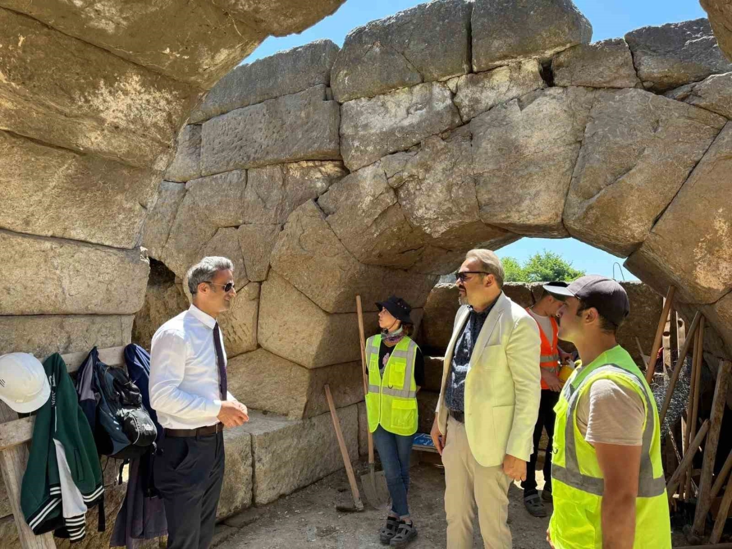 İncelemeler sırasında Prof. Dr. Şahin Yıldırım, Kaymakam Kaya’ya kazı sürecine ilişkin teknik bilgiler vererek, antik tiyatronun tarihi önemi ve restorasyon süreci hakkında ayrıntılı sunumda bulundu.